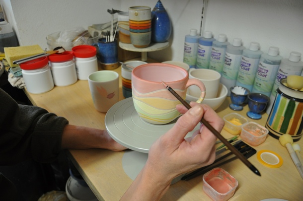 Am zweiten Märzwochenende, also am Samstag, 14. und Sonntag, 15.03., heißt es wie jedes Jahr um diese Zeit: schauen, anfassen, staunen. Zum 21. Mal findet in vielen Bundesländern der Tag der offenen Töpferei statt. In Mecklenburg/Vorpommern öffnen 91 Keramikwerkstätten, Studios und Ateliers von 10.00 bis 18.00 Uhr um Besuchern das vielseitige Handwerk zu zeigen und sich selbst in diesem Metier zu versuchen. In Bad Doberan lädt die Keramikerin Susanne Unger in die Feinart im Alexandrinenhof direkt an der Mollystation Stadtmitte zum keramischen Frühlingserwachen. Blaues und perlmuttfarbiges Gebrauchsgeschirr ergänzt sie mit fröhlich bemalten Stücken. Susanne Unger ist gelernte Scheibentöpferin und Kerammalerin. Unter ihrer Anleitung können Besucher selbst kreativ werden und sich ein Gefäß bemalen. Sie hat speziell für dieses Wochenende Schalen, Becher und Tassen gedreht: "Diese Gefäße habe ich, wie alle meine Teile, frei gedreht. Sie sind einmal gebrannt, also geschrüht. Unsere Gäste können sie in Klebetechnik oder mit Stempeln gestalten. Auch freies Bemalen ist möglich. Beim Bemalen wirken die Farben sehr hell und pastellig. Erst beim Brand entfalten sie ihre volle Intensität." Die bemalten Gefäße können nicht sofort mitgenommen werden. "Sie werden zum Teil noch glasiert und in meinem Brennofen bei weit über 1200 Grad gebrannt. Dann sind sie gebrauchsfertig, sogar mikrowellen-
